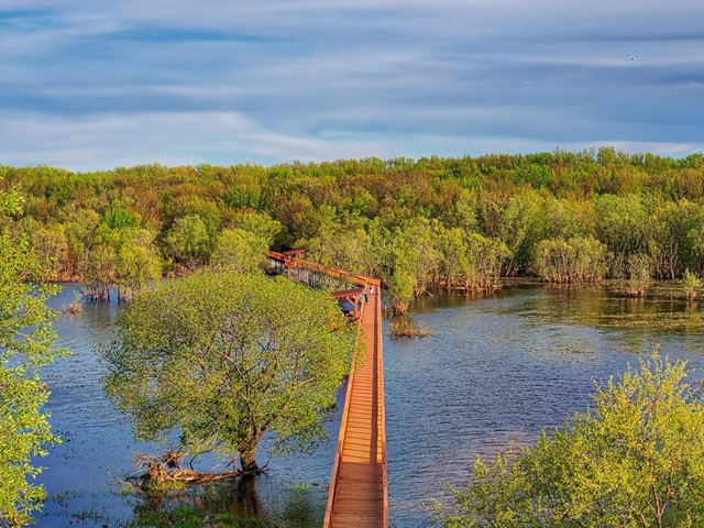Wooden footbridge on pylons cross the woods and marsh leading to the shores of Lac Saint-Pierre